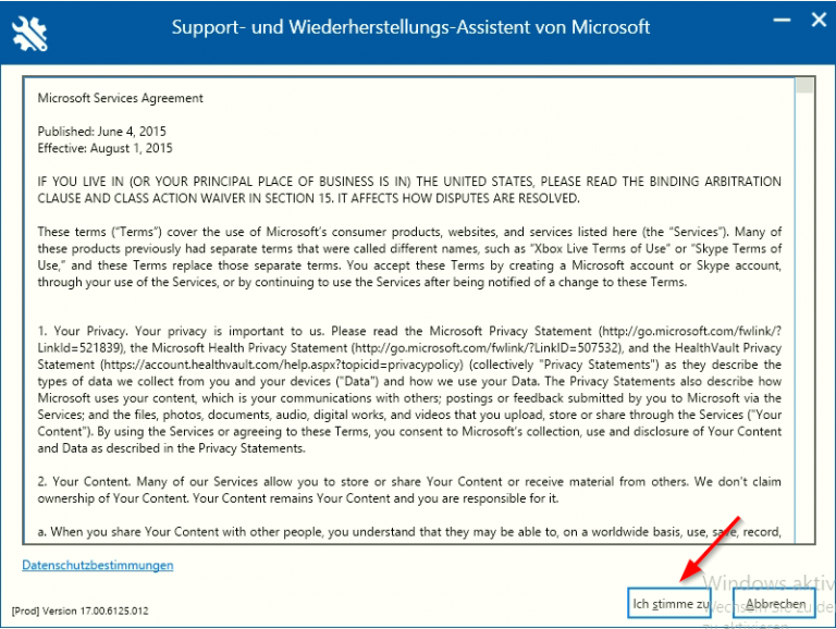 Haben Sie das Tool installiert, öffnet sich ein Fenster mit den Datenschutzbestimmungen des Support- und Wiederherstellungs-Assistenten von Microsoft. Wählen Sie hier „Ich stimme zu“ aus.