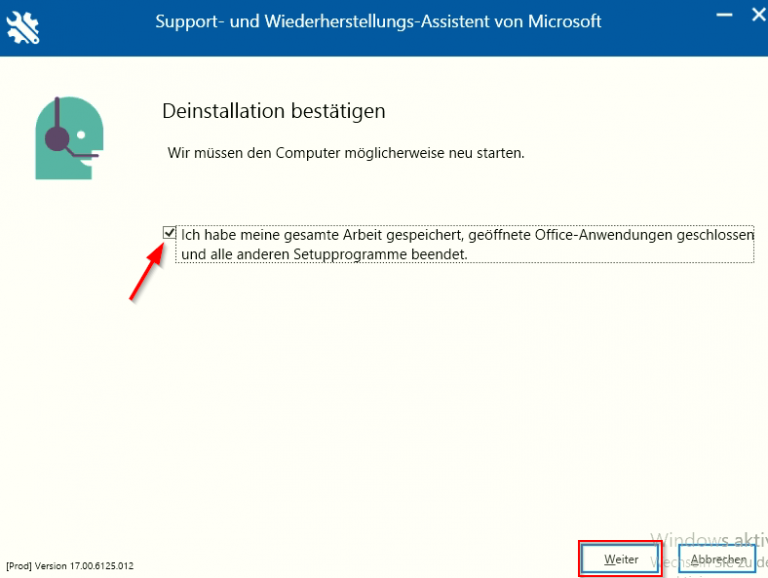Im Rahmen der Deinstallation muss Ihr Rechner möglicherweise neu gestartet werden. Stellen Sie also sicher, dass Sie alle anderen Programme schließen und Arbeiten speichern. Erst danach bestätigen Sie dies, indem Sie in das kleine Kästchen klicken – hier erscheint dann ein Haken. Klicken Sie dann auf „Weiter“.