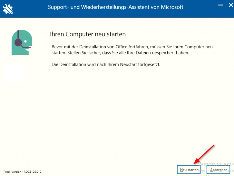 Es kann einige Minuten dauern, bis der erste Schritt der Installation fertig ist. Gedulden Sie sich, bis die Meldung erscheint, dass Ihr Rechner neugestartet werden muss. Bestätigen Sie dies über das Feld „Neu starten“.