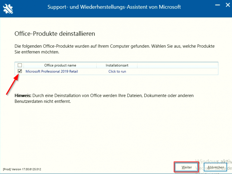 Anschließend werden Ihnen alle Office-Produkte angezeigt, die sich auf Ihrem Rechner befinden. Wählen Sie „Office 365“ aus, indem Sie in das kleine Kästchen vor der Produktbeschreibung klicken. Hier erscheint dann ein Haken. Klicken Sie anschließend auf „Weiter“.